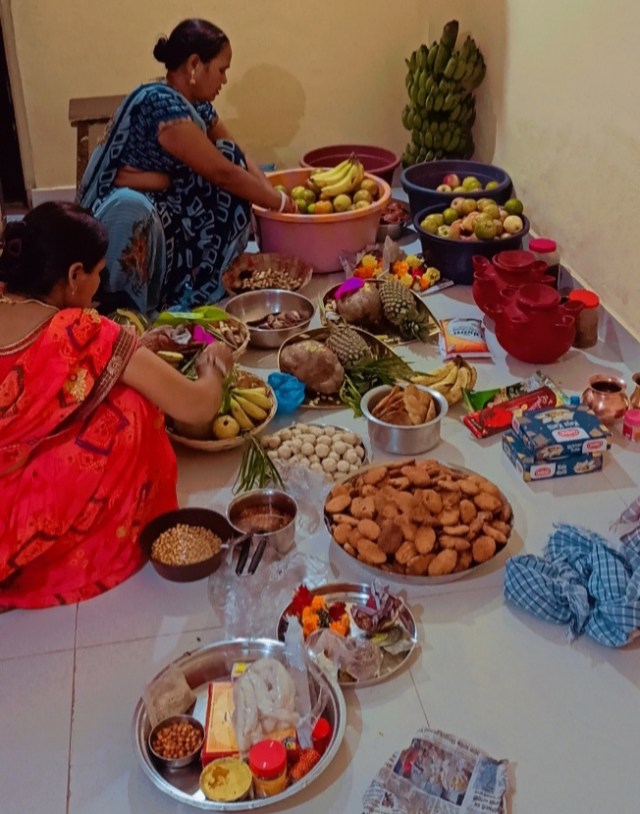 - As prasad, take thekua, malpua, kheer-puri, semolina pudding, rice ladoos.etc