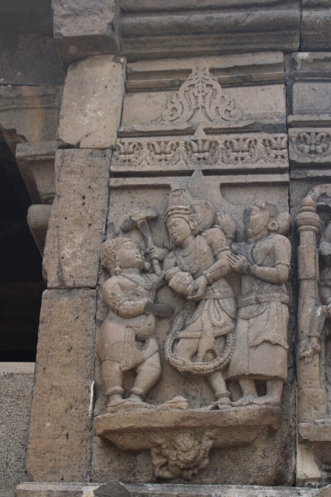 As promised to the earth goddess, Naraka was allowed to enjoy a long reign. At last, Vishnu was born as Krishna. Aditi, who was a relative of Krishna’s wife Satyabhama (believed to be an avatar of Bhudevi – Narakasura’s mother), approached Satyabhama for help. When Satyabhama heard of the Narakasura’s ill-treatment of women and his behaviour with Aditi, she was enraged. Satyabhama approached Krishna for permission to wage a war against Narakasura. As promised to the devas and Aditi, Krishna attacked the great fortress of Narakasura, riding his mount Garuda with wife Satyabhama.
